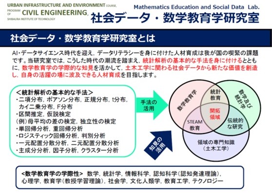 土木工学分野でも,様々なデータを扱い,統計分析は必要不可欠です。そのため,数学教育学の知見を活かしながら,現在は,学校教育あるいは高等教育,技術者教育(土木工学教育)として,DS内容をどのように学ぶべきか,データリテラシーとしてどのような知識やスキルを身につけるべきかを視野に入れながら研究を進めています。